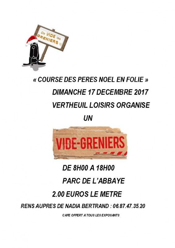 Dans le cadre de leur 7ème édition de la "Course des Pères Noël en Folie", Vertheuil Loisirs organise un vide-greniers.